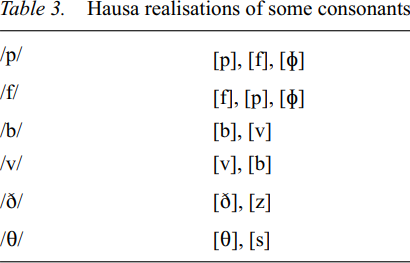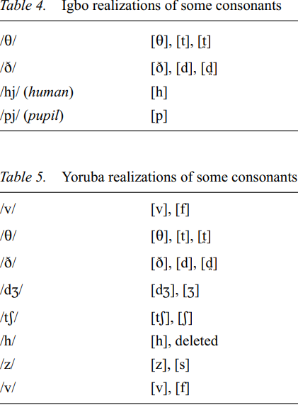 NigE is non-rhotic. The consonant system of NigE shows a lack of the postalveolar fricative /Ʒ/ and the velar nasal /ŋ/, which only exist in the speech of very sophisticated speakers with speech training (Jibril 1986). The consonant phonemes vary in their realizations between Hausa English, Yoruba English and Igbo English as illustrated in Tables 3 to 5 (cf. Jibril 1986; Jowitt 1991).