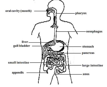 The process of nutrition in man is holozoic. In this type of nutrition, the nutrients are made available to the body through digestion of food. In digestion, the macromolecules or biopolymers of food are hydrolyzed to yield their corresponding monomers. This process is facilitated by enzymes. Thus the digestive system comprises the alimentary canal, associated glands and regions of absorption of food. The digestive tract comprises various organs from mouth to anus.