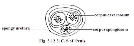 Penis - It is the male copulatory organ. It consists of two parts namely the radix or root and the corpus or body. The radix attaches the penis to the lower abdomen. The corpus is normally pendulous. It is covered by a loose skin.