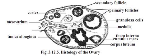 After puberty the cortex forms the major part of the ovary. It contains ovarian follicles and corpora lutea of various sizes. Their size depends on the stage of menstrual cycle or age. The cortex is filled with stroma composed of collagen. The follicles are embedded in the stroma.