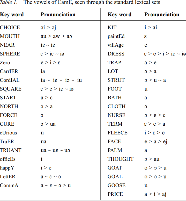 Seen through Wells’ lexical sets, and accommodating both Foulkes and Docherty’s (1999) addition as well as the modifications suggested by the split observed in CamE phonology, the vowels of CamE can be summarized as in Table 1.
