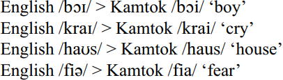 Some of the mergers and restructuring of vowels and diphthongs reported above are not generally found in the Kamtok of English-Kamtok bilinguals. The resurfacing of these sounds in regular Kamtok speech arises from the very close contact that exists between the two languages in the English-speaking provinces of Cameroon which are home to mainstream Kamtok. The presence of such sounds in Kamtok speech constitute a kind of linguistic interference, though some of the sounds have also been found in the Kamtok of those whose knowledge and use of English are not confirmed. Thus, the close contact that exists between English and Kamtok may be leaving more permanent marks on the latter. On the one hand, diphthong-like combinations of vowels such as /ai/, /ɔi/ , /au/ and /ia/ are seen to occur in the same word positions as the English diphthongs /aɪ/ , /ɔɪ/ , /aʊ/ and /iə/ respectively: