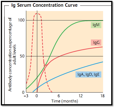 Fig. 1 Synthesis of significant amounts of immunoglobulins only begins during the perinatal period (uninterrupted lines). IgG from the mother is therefore the child’s main means of protective immunity before the age of three to six months (dotted line). Infections encountered during this early period are attenuated by maternal antibodies, rendering such infections vaccine-like.