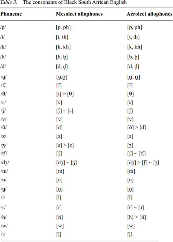 Hundleby (1963: 101) already claimed that the consonants of BlSAfE are more similar to native varieties of SAfE than the vowels, a claimed confirmed by most subsequent publications. The most important phonemes and allophones of mesolect and acrolect BlSAfE are presented in Table 3