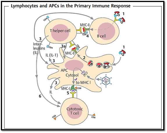 Mature T cells expressing CD4 are called T helper (Th) cells, reflecting their role in co-operating with B cells. Foreign antigens, whose three-dimensional structures are recognized by B cells, also contain linear peptides. During the initial phase of the T helper cell response, these antigens are taken up by APCs, processed, and presented as peptides in association with MHC class II molecules—allowing their recognition by Th cells. Prior to our understanding of MHC restriction, B-cell epitopes were known as haptens, whilst those parts of the antigens which bore the T-cell epitope were known as carriers. 1n order for T cell activation to occur, antigen-transporting APCs must first reach the organized secondary lymphoid organs (Fig. 1), since proper contact between lymphocytes and APCs can only take place within these highly organized and compartmentalized organs. The cytokines IFNy, 1L-1,1L-2,1L-4, and 1L-12 play an important role in this process—as do various other factors.