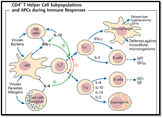 Fig. 3 TH1 and TH2 cells are derived from a TH0 cell, and undergo differentiation in the presence of help derived from cytokines, DC, macrophages, and other cell types. TH1 cells are activated byIL-12and IFNy and inhibited by IL-4; whilst for TH2 cells the reverse is true. Viruses and bacteria (particularly intracellular bacteria) can induce a TH1 response by activating natural killer cells. In contrast, allergens and parasites induce a TH2 response via the release of IL-4. However, the strong in- vitro differentiation of CD4+ Tcells intoTH1-TH2 subsets is likely to be less sharply defined in vivo.
