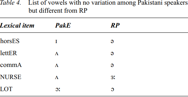 This group consists of vowels which showed no variation within Pakistani speakers, but differed from RP. Table 4 is a list of these vowels.