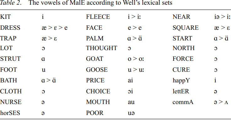 Close phonetic analysis of the vowels of MalE remains a desideratum. The following account is a preliminary one that, it is hoped, will form the basis of future work and of refinements.