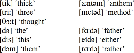 The dental fricatives /θ/ and /ð/ are often realized as the corresponding alveolar stops [t] and [d] respectively: