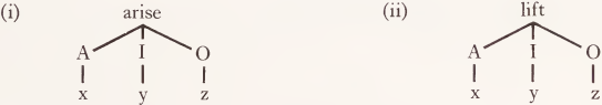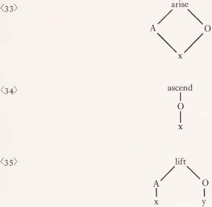 The fact that there are two case lines connecting rise with its one argument, and that the line labelled A has its case label in parentheses, reflect the fact that the argument can serve in just one of these roles (O) or simultaneously in both (A and O). Rise differs from arise in the optionality of A; it differs from ascend in having an ‘A’ line at all, and they all differ from lift in that the latter requires two arguments.1 Thus (33)-(35):