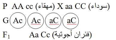 في الدجاج لايتكون اللون في الريش في حالة الأليل السائد للجين A أو عند وجود الأليلالمتنحي في حالة متماثل الزيجة للجين B لذلك فإن التضريب التالي Aa Bb X Aa Bb سوف يعطي في النسل الناتج 3 دجاج ملون (aa B-) والدجاج غير الملون سوف يحتوي على A ونسبته 12 أو bb ونسبته 1 .