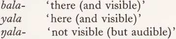 bala- is also the unmarked form, used when no implication of location/visibility is intended. The second element is a case morpheme: zero for nominative, -ŋgu- for ergative, -gu- for dative, -ŋu- for genitive. Finally there is indication of noun class: -l for class 1, -n class 11, -m class III and zero for class IV (for a full discussion of the noun classes, and their semantic content, see Dixon 1968 b).