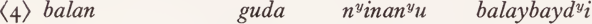 From our assumption that a one-to-one Guwal-Dyalŋuy correspondence implies a relation of synonymy between the words concerned, and the fact that verbalizer -bin does not change the semantic content of a word, but just marks it as an intransitive verbal, it follows that the semantic content of waynydyin must be the same as that of dayu, and so on. (That is, leaving aside the feature ‘ long way ’ in the semantic description of dayu; verbs of motion do not specify distance and in fact Dyalŋuy correspondents involve the unmarked feature from the system {long, medium, short distance}.)