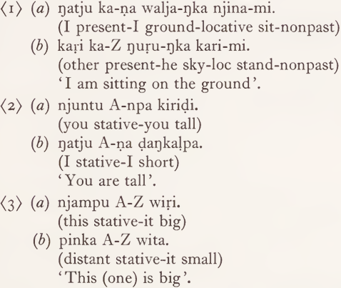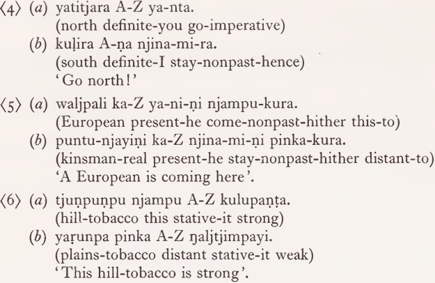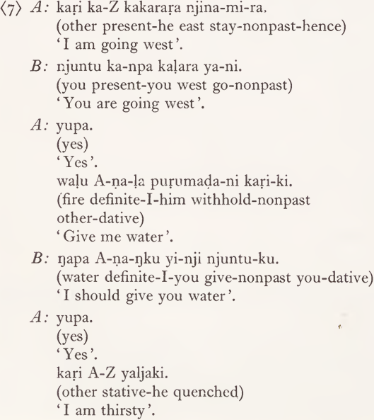 In very general terms, the rule for speaking tjiliwiri is as follows: replace each noun, verb, and pronoun of ordinary Walbiri by an ‘antonym’. Thus, for example, if a tjiliwiri speaker intends to convey the meaning ‘ I am sitting on the ground ’, he replaces ‘ I ’ with ‘ (an)other ’, ‘ sit ’ with ‘ stand ’, and ‘ ground ’ with ‘ sky ’. Similarly, if he intends to convey the meaning ‘ You are tall ’, he replaces ‘ you ’ with ‘I’, and ‘tall’ with ‘short’. To illustrate, I cite simple sentences in Walbiri (the (a)-form) together with their tjiliwiri equivalents (the (b)-forms) and their English translations.2
