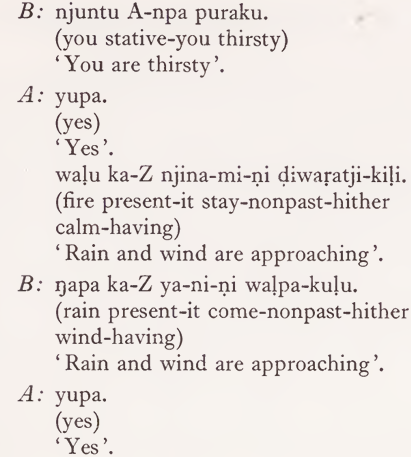 Ordinary Walbiri is spoken rapidly, and apparently, tjiliwiri speech is equally fast. Novices are not taught the semantic principle directly; rather, they must learn it by observation. According to my consultants, the novices are exposed to rapid dialogues between guardians. In these dialogues, one guardian speaks tjiliwiri while the other answers, or rather interprets the message, in Walbiri. Each exchange in the dialogue is punctuated by the expletive yupa, an exclusively tjiliwiri word. In the following illustrative dialogue, the first individual, A, speaks tjiliwiri, and the second, B, responds in Walbiri. The free translation of the tjiliwiri speech represents the intended message; the parenthetic gloss is literal.