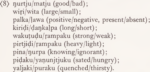 An obvious antonymy principle is that of polarity, i.e., the principle involved in oppositions of the type represented by English good/bad, big/little, strong/weak. This principle is used wherever possible to determine tjiliwiri equivalents, as in: