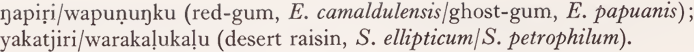(semen, coitus/mulga seed); kuna/wamulu (excrement/animal or vegetable down used in ritual decoration);