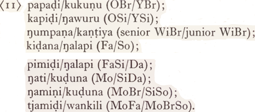 The observation just made leads to another one which reveals rather well the abstract nature of the tjiliwiri activity. It could conceivably be argued that phonologically unified elements of the type represented by /ŋalapi/ (So, Da) are not semantically ambiguous in the way I have implied; i.e., one might argue that the term /ŋalapi/ is simply the name for the class of Ego’s agnates in the first descending generation and that the principle of sex antonymy plays no role at that point in the Walbiri kinship system. We know that this is not the case, since the kinship system as a whole requires recognition of a class of male /ŋalapi/ as opposed to a class of female /ŋalapi/ - this is shown, e.g., by the fact that the offspring of Ego’s male /ŋalapi/ are his parallel (in fact, agnate) kinsmen, while the offspring of his female /ŋalapi/ are not; furthermore, there is a technical usage according to which the female, but not the male /ŋalapi/ is referred to by the special term /yuṇṭtalpa/ (cf. Meggitt, 1962, p. 115). The male and female /ŋalapi/ are clearly distinct in tjiliwiri usage - the male is opposed to /kidana/ (Fa), while the female is opposed to /pimiḍi/ (FaSi). And, in general, polysemy is reflected in tjiliwiri practice: