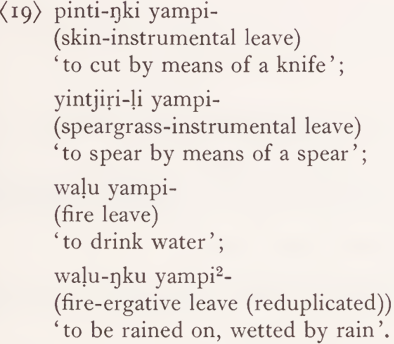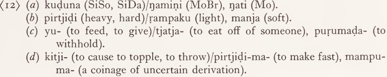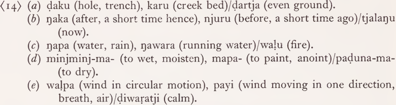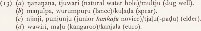 It is clear from these examples that the tjiliwiri principle of antonymy is semantically based, i.e., that the process of turning Walbiri ‘up-side-down’ is fundamentally a process of opposing abstract semantic objects rather than a process of opposing lexical items in the grossest and most superficial sense. This abstract nature of the tjiliwiri activity is particularly evident in cases of the type represented by (14 a-e) in which an opposition reflects the partial synonymy of lexical items - that is, cases in which one semantic object is opposed to another which enters into the make-up of two distinct though semantically related lexical items:
