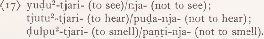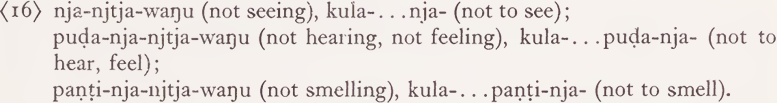 What is of interest here is the fact that an important aspect of the internal structure of this lexical subset can be revealed, in standard Walbiri usage, only by recourse to a syntactic device, i.e., negation. The abstract semantic structure of the subset must provide that each of the three perception verbs be paired by an antonym - it is relatively apparent that the three verbs cannot themselves be contrasted with one another in any way which is obviously consistent with the principle of minimal opposition. In a rather clear sense, then, the Walbiri domain of perception contains six terms, rather than three - in other words, it contains three pairs of opposed terms. Since Walbiri has no standard antonyms for the perception verbs, the domain is lexically defective and is completed only by negating the existing forms in one way or another: