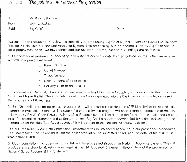 Let me demonstrate how your thinking would develop by using the technique to rewrite the memorandum shown in Exhibit 5, on the next page. It comes from the Accounting Department of a large soft drinks company in the United States.
