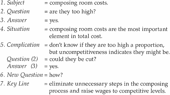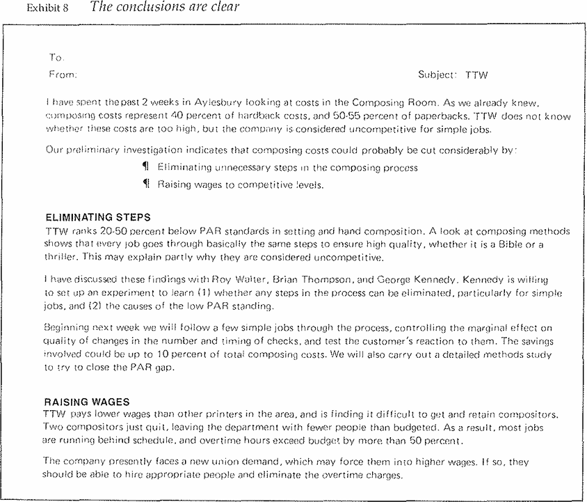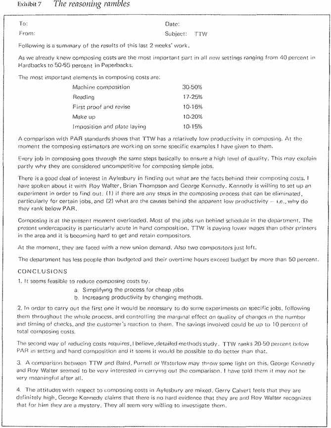 Again, let me demonstrate how this technique would work by using a document that needs rewriting (Exhibit 7). This is a memorandum written by a young consultant to his engagement manager after 2 weeks of working on his first assignment. The client was a printing company in England.