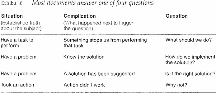 Using the previously established truth about the subject as its starting point, the Complication goes on to tell what happened next in the story that inevitably leads to a Question. "What happened next" is usually a variation on one of the possibilities shown in Exhibit 10.