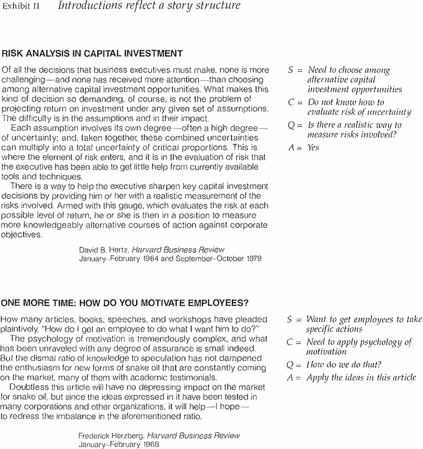 Exhibit 11 shows an example of each type of structure, all drawn from Henry Strage's Milestones in Management, an anthology of literature that has helped to shape management thinking over the last 30 years.1 As you read them, you might want to note the many variations there can be in style as one tries to bring to life the story reflected in the bare bones of the S-C-Q structure.