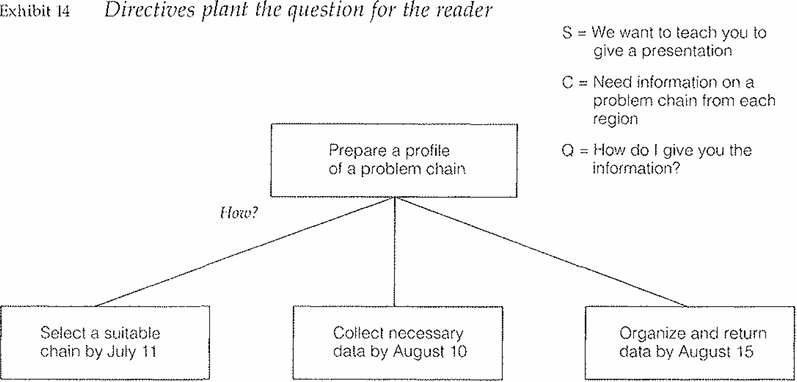 In this example, the question is "How?" Whenever the question is "How?" the answer is invariably "steps," so that you would end up with a structure something like that shown in Exhibit 14. Note also that the Complication and the Answer are roughly reversals of each other, since the Answer is the effect of carrying out the actions, which of course would solve the problem.