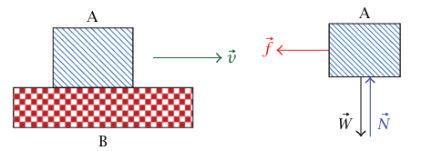 شكل 2–22: إذا كان A يتحرك نحو اليمين بالنسبة إلى B، فإن قوة الاحتكاك التي يؤثر بها B على A تكون متجهة نحو اليسار.