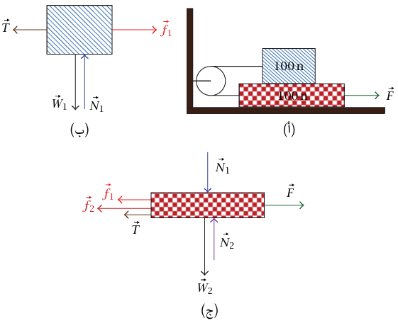 مثال 2–13 (كتلة فوق أخرى متصلتان من خلال بكرة). كتلة وزنها 100 نيوتن (N) موضوعة فوق كتلة أخرى وزنها 200 نيوتن. الكتلتان متصلتان بواسطة وتر غير قابل للمط، يمر من خلال بكرة ملساء مثبتة في حائط (شكل 2–23 (أ)). معامل الاحتكاك الحركي بين الكتلتين هو 0.6 ومعامل الاحتكاك الحركي بين الكتلة السفلية والأرضية هو 0.5. ما القوة الأفقية F التي ينبغي تطبيقها على الكتلة السفلية لإبقائها متحركةً نحو اليمين بسرعة ثابتة؟