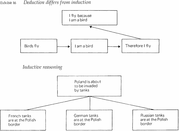 Briefly, the difference is as shown in Exhibit 16. Deduction presents a line of reasoning that leads to a "therefore" conclusion, and the point above is a summary of that line of reasoning, resting heavily on the final point. Induction defines a group of facts or ideas to be the same kind of thing, and then makes a statement (or inference) about that sameness. The deductive points derive from each other; the inductive points do not.