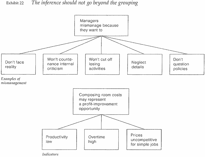 What about the next one? If productivity is low, overtime high, and prices uncompetitive, can you infer that you have a profit-improvement opportunity? Perhaps, but I can think of three or four other things that could also be labeled indicators of a profit-improvement opportunity. In that case, you know the overall point is at too high a level of abstraction in relationship to the three points grouped below, since it does not make a statement specifically and only about them.