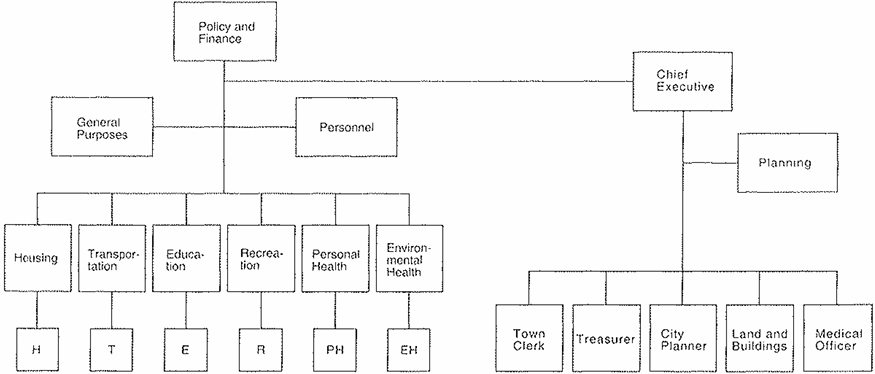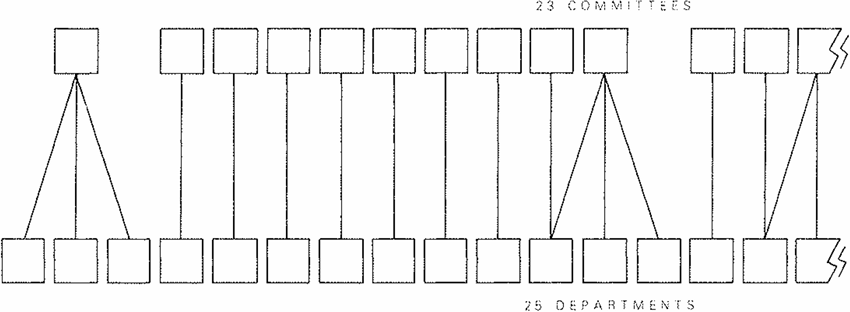 Visualizing a process in relationship to a structure is a common device, particularly if you are writing to recommend changes to an existing structure. Suppose, for example, you had the structure of a city government shown here, with 25 departments reporting to 23 committees ...