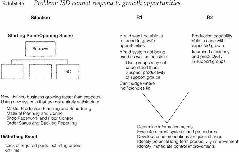 Having said that, the diagnostic frameworks you need to develop to analyze a problem efficiently are generally implied by the Opening Scene of the problem definition. For example, Exhibit 46 shows the problem definition for a typical proposal to the Information Systems Division of a company called Barrows, and the steps the consultant said he would follow to solve the problem.