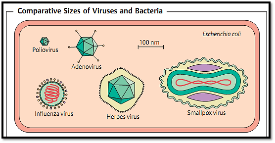 Fig. 1 Different virus species are shown here to scale inside an E. coli bacterium.