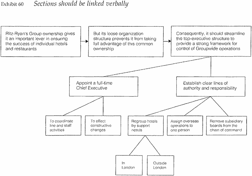 You follow precisely the same technique at the beginning of a new section, a new subsection, or sometimes a new set of support points. Suppose you had just finished a section telling the Ritz-Ryan hotel chain that it was not taking full advantage of its common ownership of many hotel, restaurant and catering operations. You are about to start a new section outlining the structural weaknesses that keep it front being able to act as it should, and you have a pyramid like that shown in Exhibit 60.