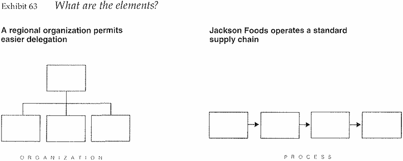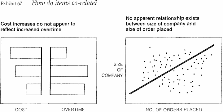 Exhibit slides generally show the parts of a structure or process, or display data in a visual way, using charts formed into pies, bars, columns, curves, or dots. The diagrams and charts tend to be used to answer five kinds of question (Exhibits 63-67):