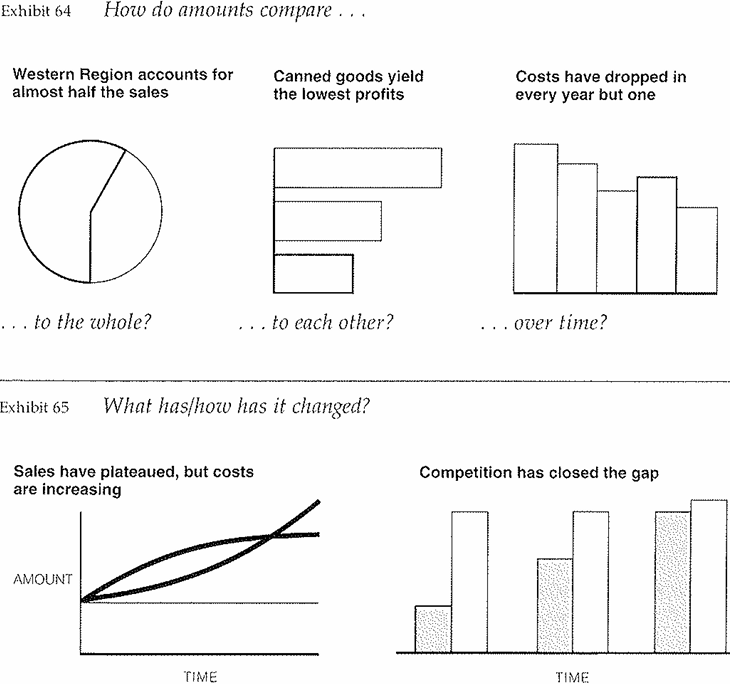 The trick is to decide the question you want the exhibit to answer, state the answer as the title to the chart, and then choose the chart form most appropriate to showing that point.