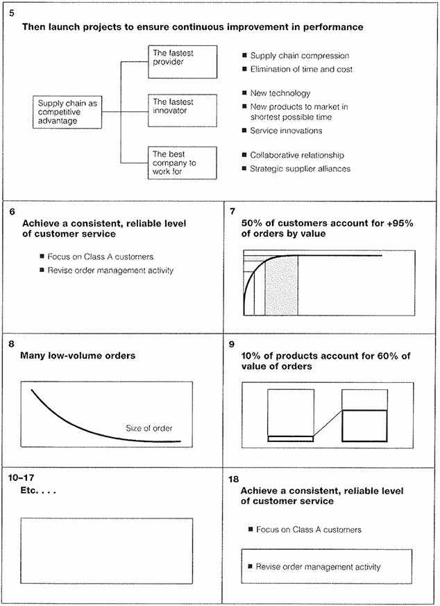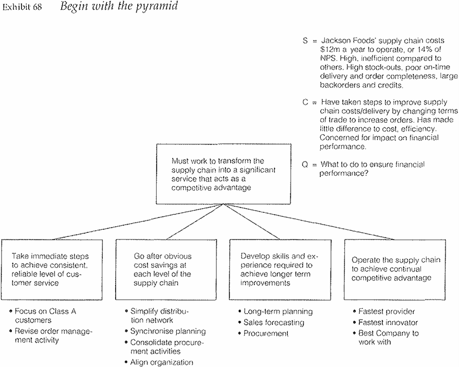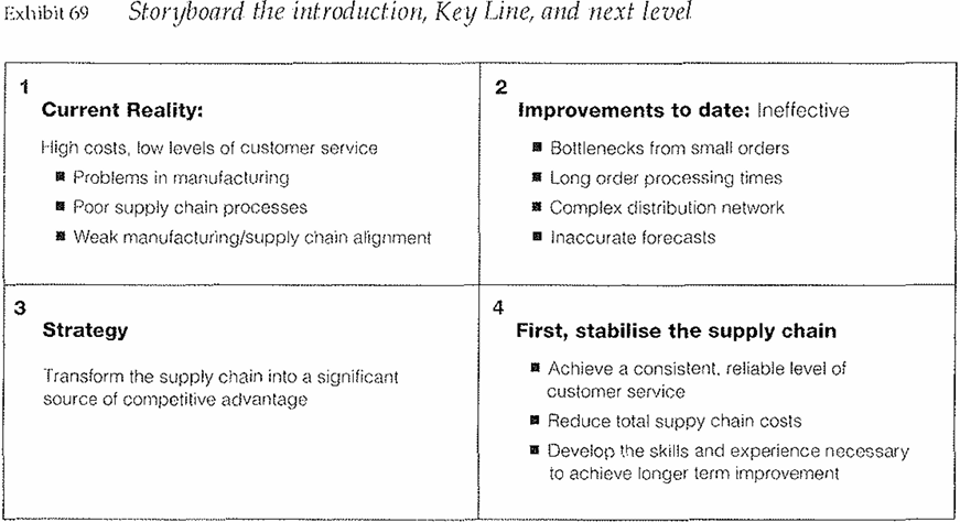 To illustrate, Exhibit 68 shows a typical pyramid, while Exhibit 69 shows how the first few slides might have looked in storyboard form. The thing to remember is that you want each slide to have a sentence or phrase at the top that conveys the point it is meant to illustrate. This device will act as a reminder both to you as you present and to the audience as it listens, particularly if you have the slide on the screen for any length of time.
