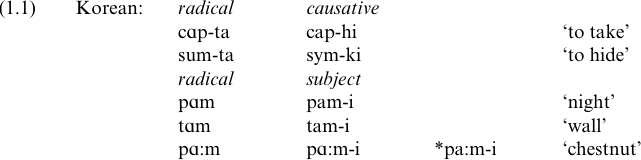 Our first sound change type is assimilation, which perhaps predictably involves elemental composition, with one locally present element spreading from its own segment onto another. Take, for instance, the case of Korean umlaut discussed in Kaye, Lowenstamm and Vergnaud (1990), and shown in (1.1).