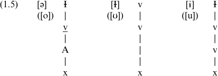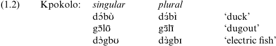 However, in other cases in Kpokolo, similar rounding alternations arise without any loss of a skeletal slot. Kpokolo has three back unrounded vowels, which alternate with the rounded vowels in brackets, as shown in example (1.5). The unrounding is accomplished by dis sociating the U element and replacing it with the cold vowel. The question is why the U is allowed to be dissociated here. It gives the right results; but it is presented simply as part of the description, without any reference to a principle which might control the dissociation. The conclusion at present must be that the deletion of segmental positions is better regulated than the deletion of single elements.