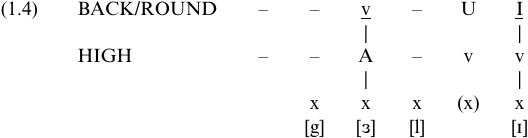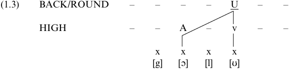 In the singular (see (1.3)), the rounding of the stem vowel, which is lexically represented as simply the element A, is taken to be a function of the suffix vowel, from which the rounding element, U, spreads.