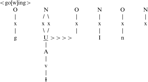 Some rather similar problems arise in OT, although very few cases of sound change are discussed in the OT literature to date, and I therefore limit my comments here to cases of apparent insertion and deletion. As we have seen, OT involves the generation of candidate parses from a lexical entry; these are then evaluated by a language specifically ranked set of universal constraints, and the maximally harmonic parse, which violates the fewest high-ranking constraints, is selected. This evaluation process can be represented in the type of constraint tableau shown in (1.11) for the two constraints ONS and HNUC and Imdlawn Tashlhiyt Berber, where any segment can be a syllable nucleus. Given a sequence /ul/, either the first segment will be parsed as nuclear, or the second. The harmonic parse is the latter, with the lateral nuclear. Therefore we assume that ONS must dominate HNUC in Imdlawn Tashlhiyt Berber. In constraint tableaux, * signals a `black mark' assigned by a violated constraint, while ! indicates that the violation is fatal to that parse.