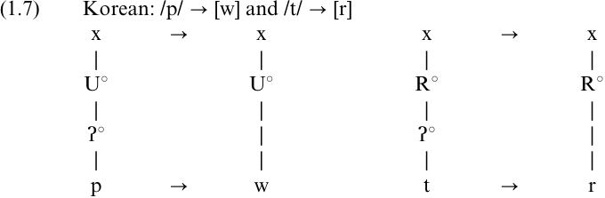 Lenition in Government Phonology involves elemental decomposition, or reduction in segmental complexity. To take one fairly straightforward example (1.7), the case of Korean /p/ → [w] and /t/ → [r] can be seen as the delinking of the occlusion element.