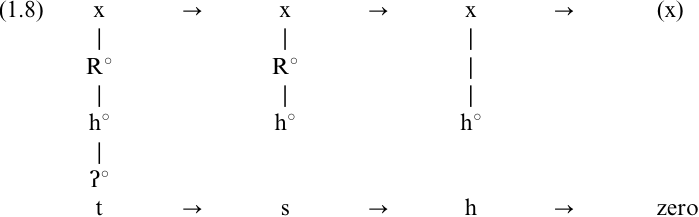 It is also possible (Harris 1990) to regard trajectories of lenition as the progressive decomposition of elements; (1.8) shows a typical sequence from /t/ to /s/ to /h/ to zero.