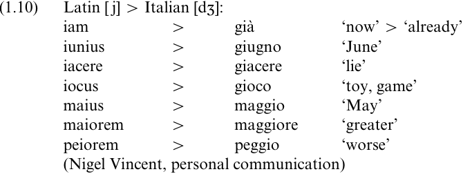 Furthermore, Harris notes that he cannot model what he calls `spontaneous' fortition, notably Latin maior → Italian maggiore. Again, this might reflect spread of the occlusion element, but this time there is no immediate source. Harris suggests that this is perhaps not of great concern, as the change is so sporadic: but there are numerous cases where the same [j] to [dƷ] change happens between Latin and Italian, as shown in (1.10). Indeed, there seem to be no cases with the same conditions where the supposedly sporadic fortition fails; so this may in fact be a real problem for Government Phonology, especially as such fortitions are repeated elsewhere in Romance (for instance in River Plate Spanish, where [j] from <-ll>, Castilian [ʎ], has regularly become [Ʒ], or initial [dƷ] alternating with medial [Ʒ]).