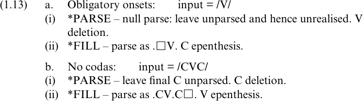 Let us first take two schematic cases: language (1.13a) requires onsets, and (1.13b) forbids codas. In (1.13a), for an input structure consisting of a single V, syllabification gives two options. We can violate PARSE by simply not parsing this vowel; that means the vowel cannot be realized phonetically, so this option results effectively in vowel deletion (although we are really leaving the structure floating or unattached, rather than deleting it sensu stricto). Alternatively, we can violate FILL by creating an empty onset slot, giving consonant epenthesis. Turning to (1.13b), an input string of /CVC/ cannot be syllabified without violating the prohibition on codas, unless we again violate PARSE or FILL. This time, violating PARSE gives effective consonant deletion by leaving the final C unparsed, while violating FILL creates an empty nuclear slot and hence a second syllable; feature fill-in of some sort instantiates a vowel, giving a percept of vowel epenthesis.