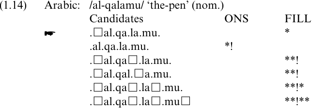 A real-language example from Arabic, where onsets are obligatory, is shown in (1.14). If there is no onset, a glottal stop is supplied, and this is a violation of FILL. We conclude that ONS dominates FILL.
