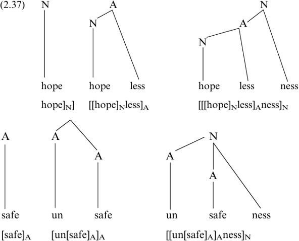 If these correspondences are accepted, Kiparsky's bracketings [[[X]Y]Z] (hopelessness) and [[X[Y]]Z] (unsafeness), which Mohanan claimed cannot be assigned tree-diagram counterparts, can be paired with the hierarchical structures in (2.37).